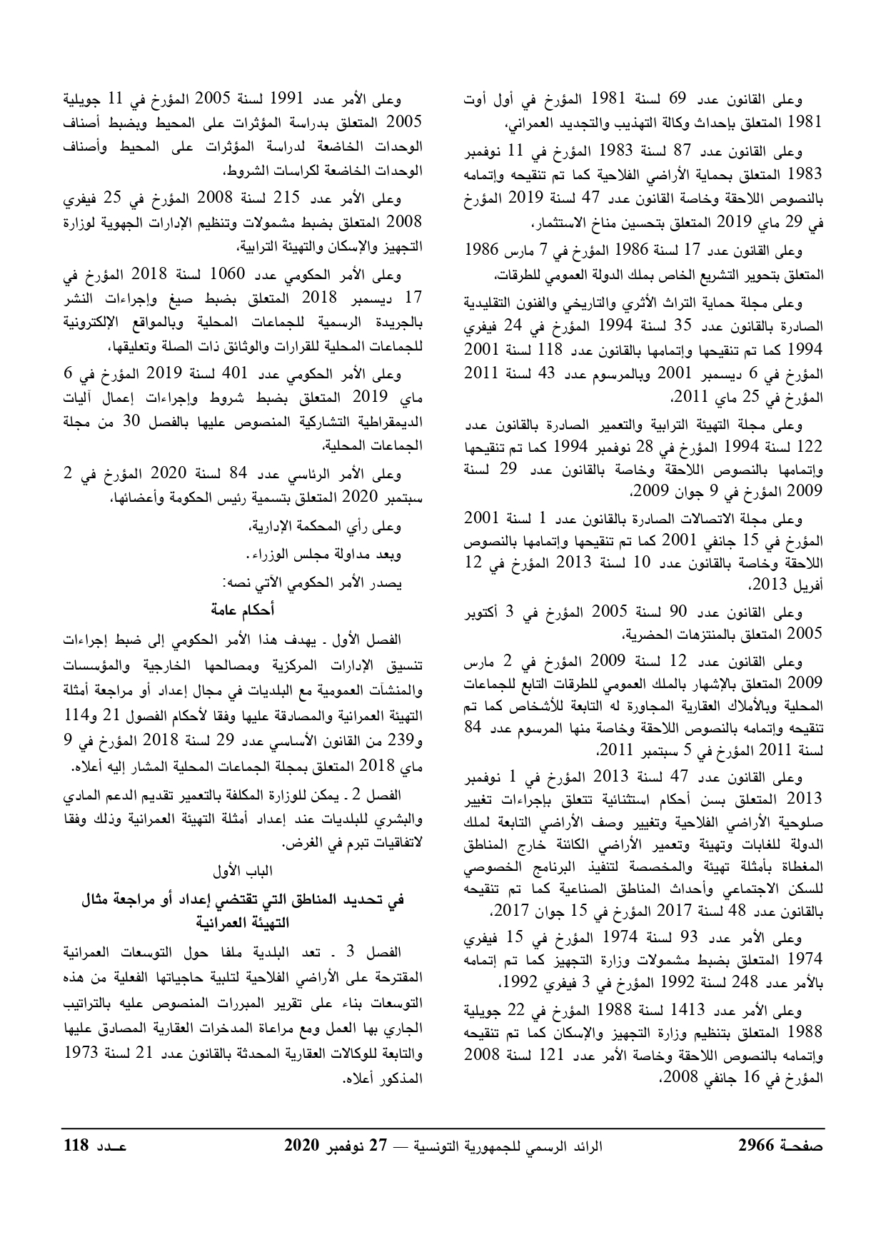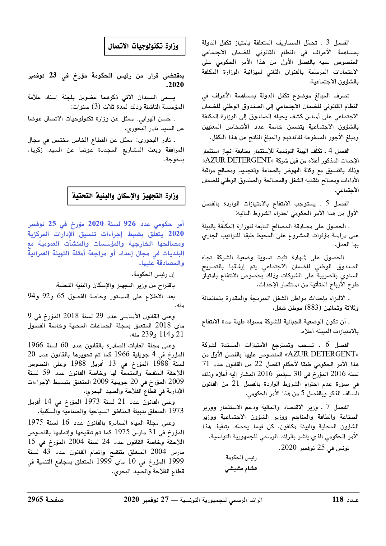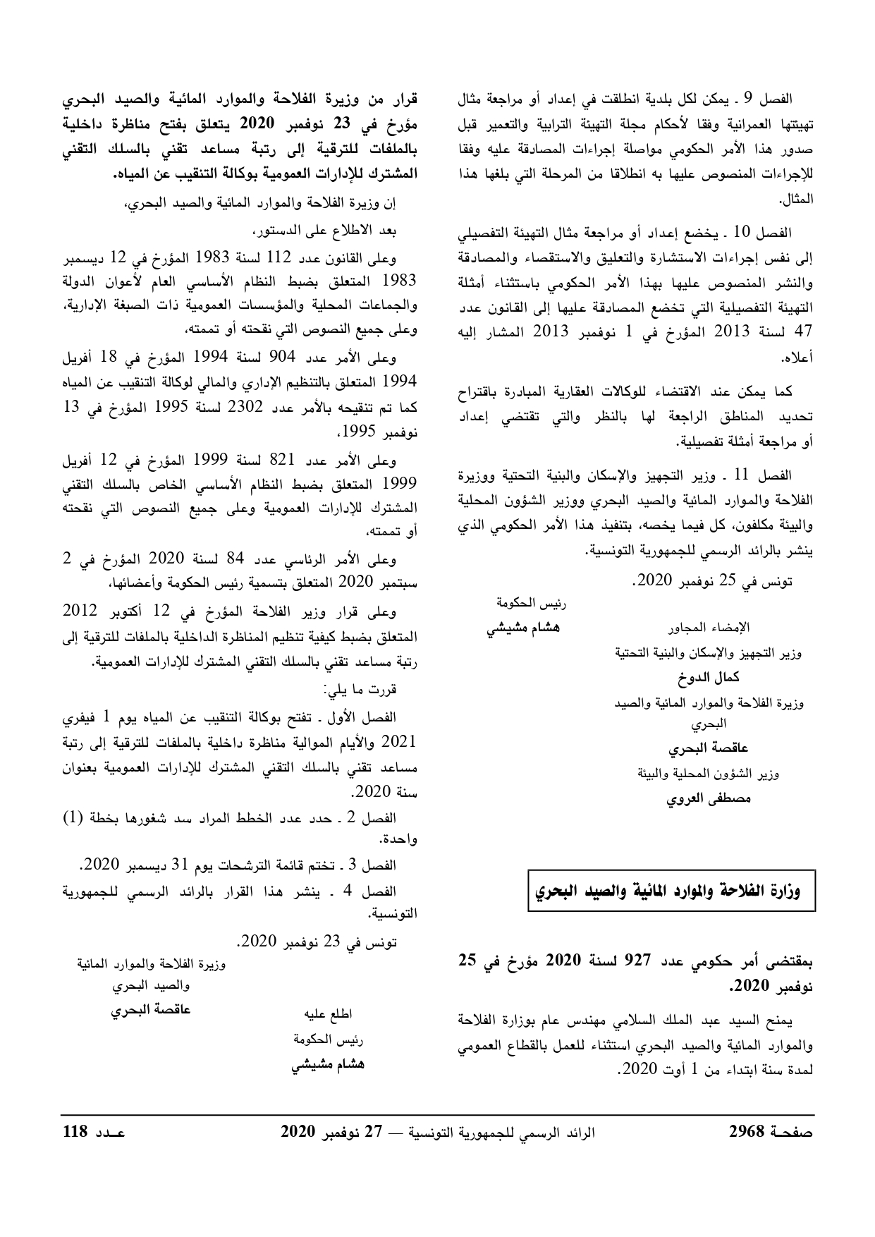 أمر حكومي عدد 926 لسنة 2020 مؤرخ في 25 نوفمبر 2020 يتعلق بضبط إجراءات تنسيق الإدارات المركزية ومصالحها الخارجية والمؤسسات والمنشآت العمومية مع البلديات