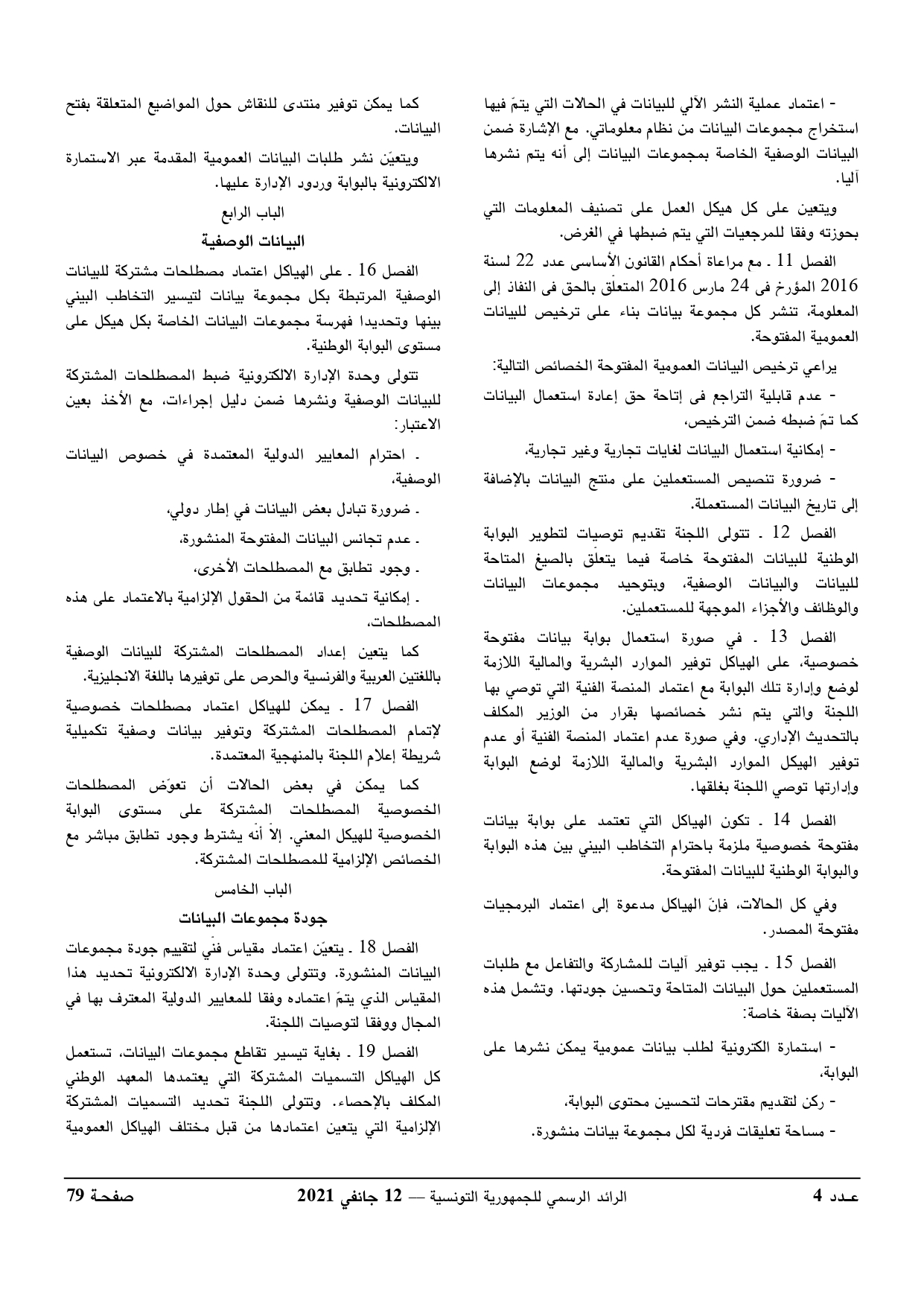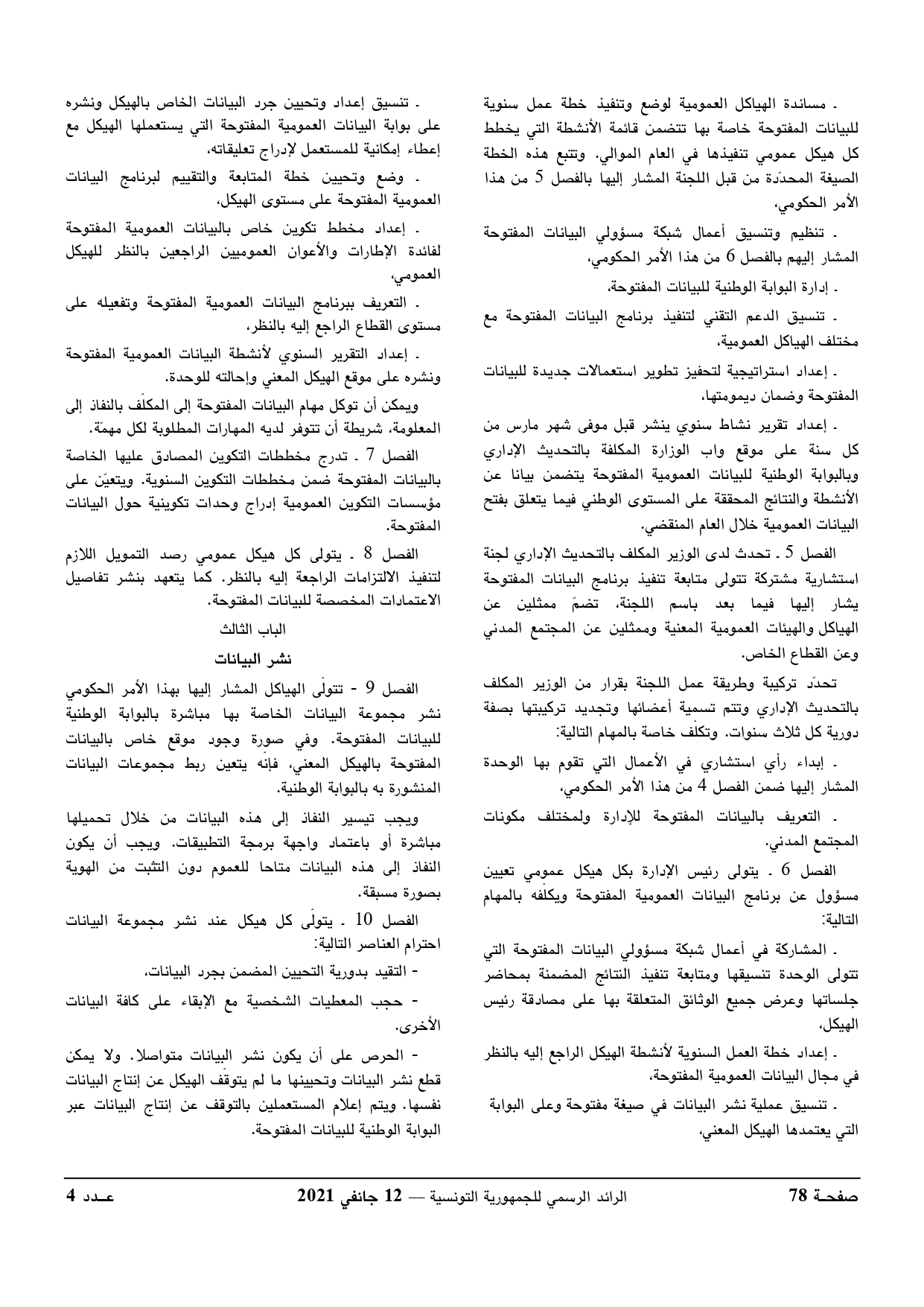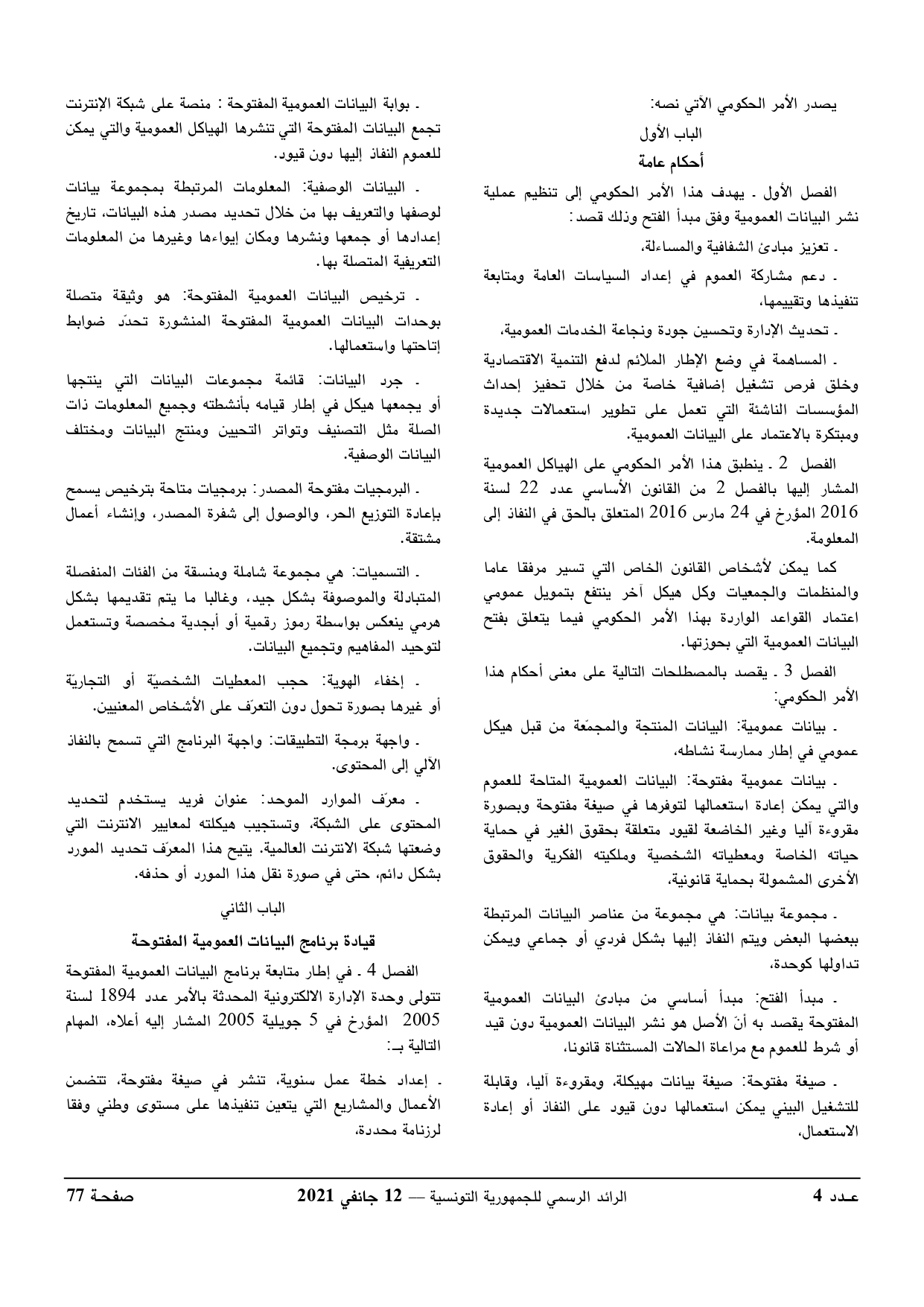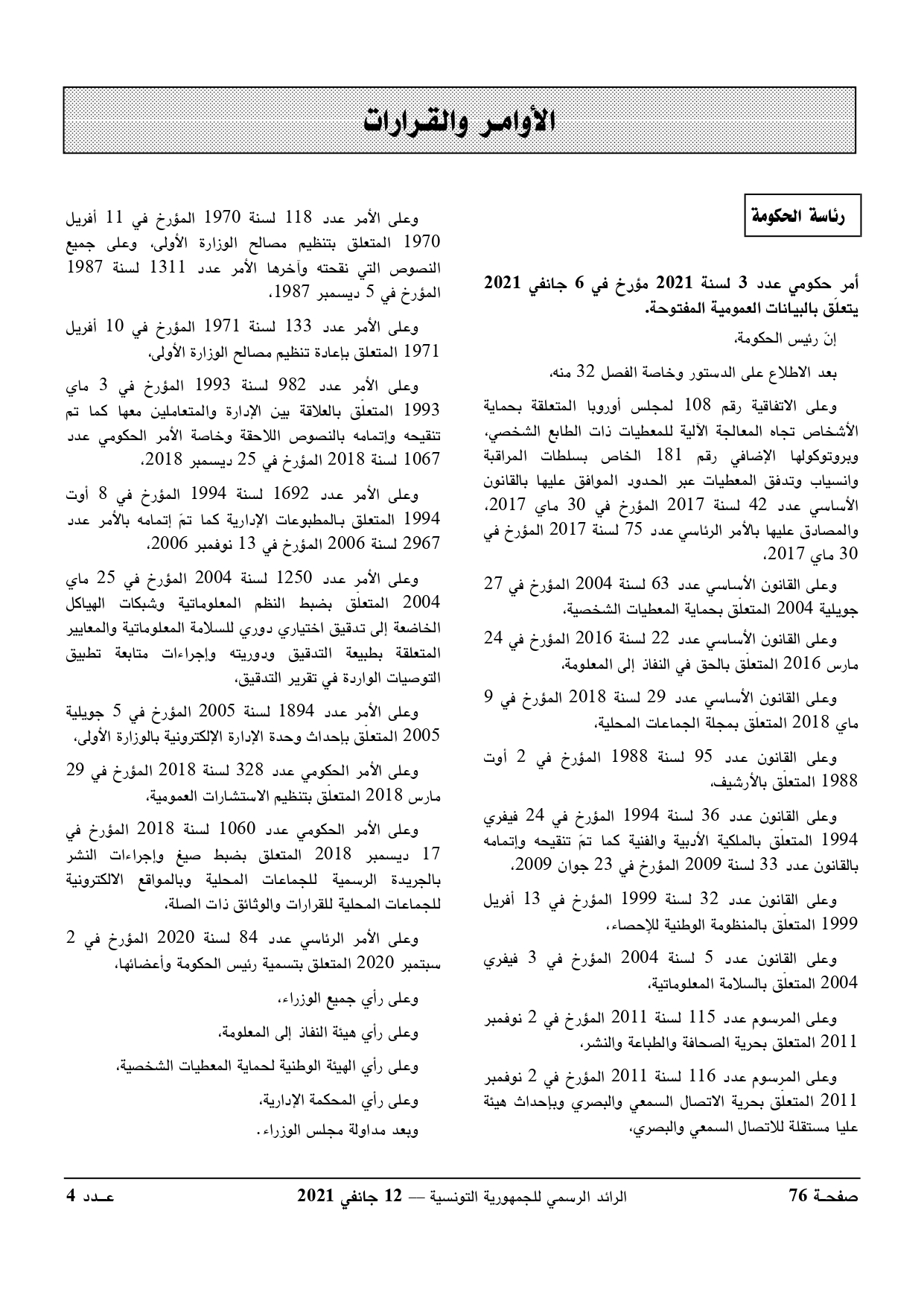 أمر حكومي عدد 3 لسنة 2021 مؤرخ في 6 جانفي 2021 يتعلّق بالبيانات العمومية المفتوحة